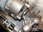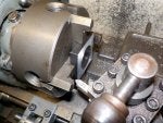 The first thing I did was mount the metal piece in the 4 jaw chuck so I could start to turn the step so that the outer part of the step will slide into the T slot. Initially I turned only the outer edge as I needed the tool bit to be on a bit of an angle so I could clear the jaws of the chuck. Once I had the outer area roughed out I switched to turning the inner part of the step leaving a 1" diameter section untouched where the stud threads into it. I also added a small scrap piece of 1/8" x 1-1/2" thick flat steel to space the piece I was turning out so the tool bit did not hit the chuck jaws.