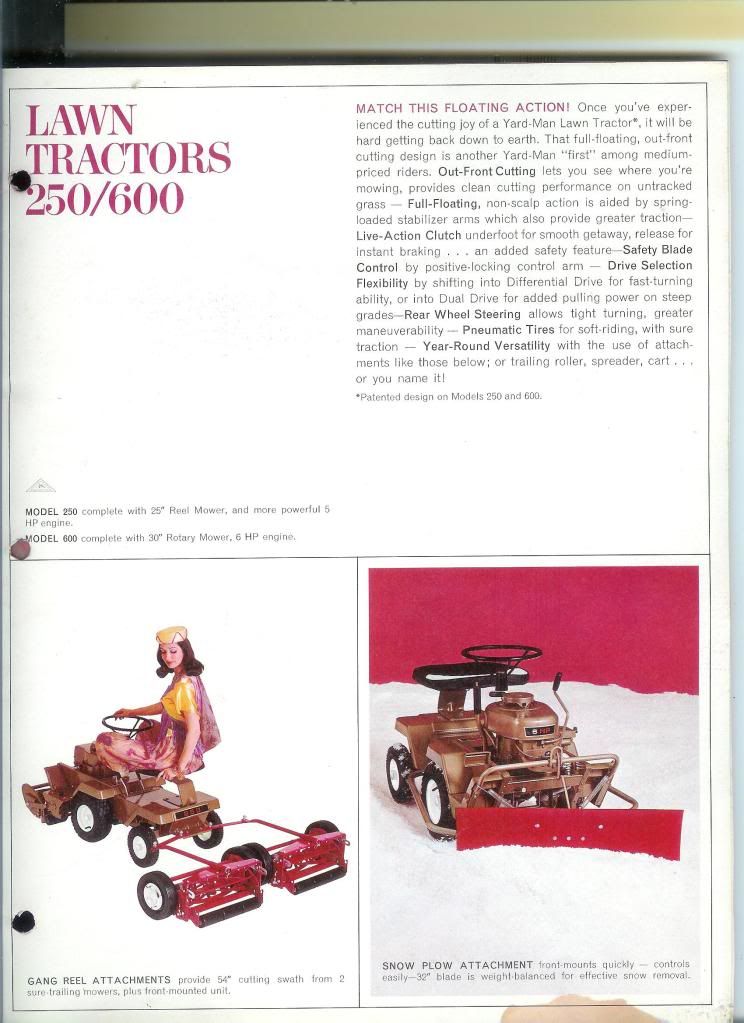 Yard-Man Made a Lot of weird Looking Mowers besides the One Pictured above I will try to Put the whole Booklet Into a PDF and Post it in the Manual Section They Made a 1 wheeled 18inch Reel Mower Which is rather funny to see Because it Looks Like someone actually Broke there Push Reel Mower:thumbs: